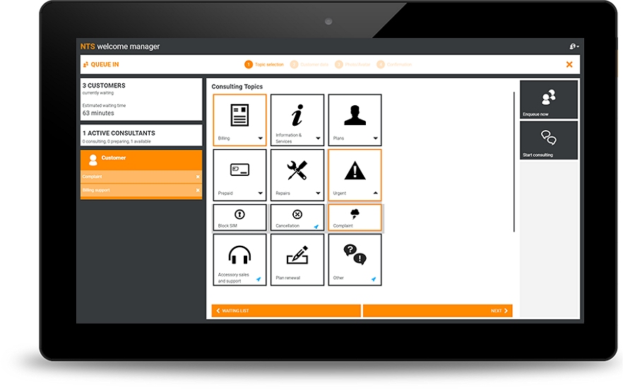 The NTS welcome manager is a highly sophisticated queue management software for retail stores. Right upon entering your shop, customers can give a brief outline of why they have come here (e.g., product consulting, contract renewal, questions about their latest invoice, etc.). The customer is automatically added to the queue for the sales agent best fitting their needs. Doing so, the sales agent has enough time to get a full overview of why the customer has come to the store and can then best serve them.